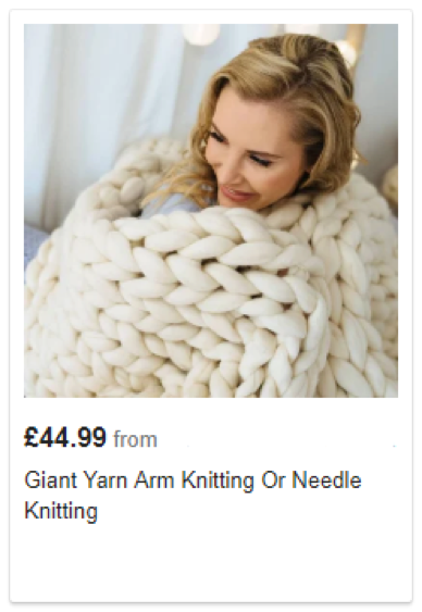 Questo potrebbe sembrare ovvio, tuttavia assicurati che altri oggetti di scena e sfondi non mettano in ombra l’articolo.Anche se conosci bene il tuo prodotto, tieni a mente che per molti clienti l’immagine rappresenta il primo momento in cui il prodotto viene visto. Per esempio, il prodotto sotto è un gomitolo di lana, tuttavia è poco chiaro dato che nell'immagine appare già utilizzato per fare una coperta: